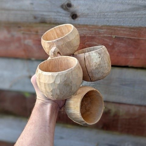 Tom has taken knife to wood since he was a teenager growing up just outside Newcastle. Sixteen years ago, his move to the Cairngorms for a job in forestry only kindled his passion for all-things wood. He is a greenwood worker, which is somebody who carves the wood whilst it is still fresh using mainly traditional tools to create animal sculptures and utensils, but he is mainly known for his cups.
