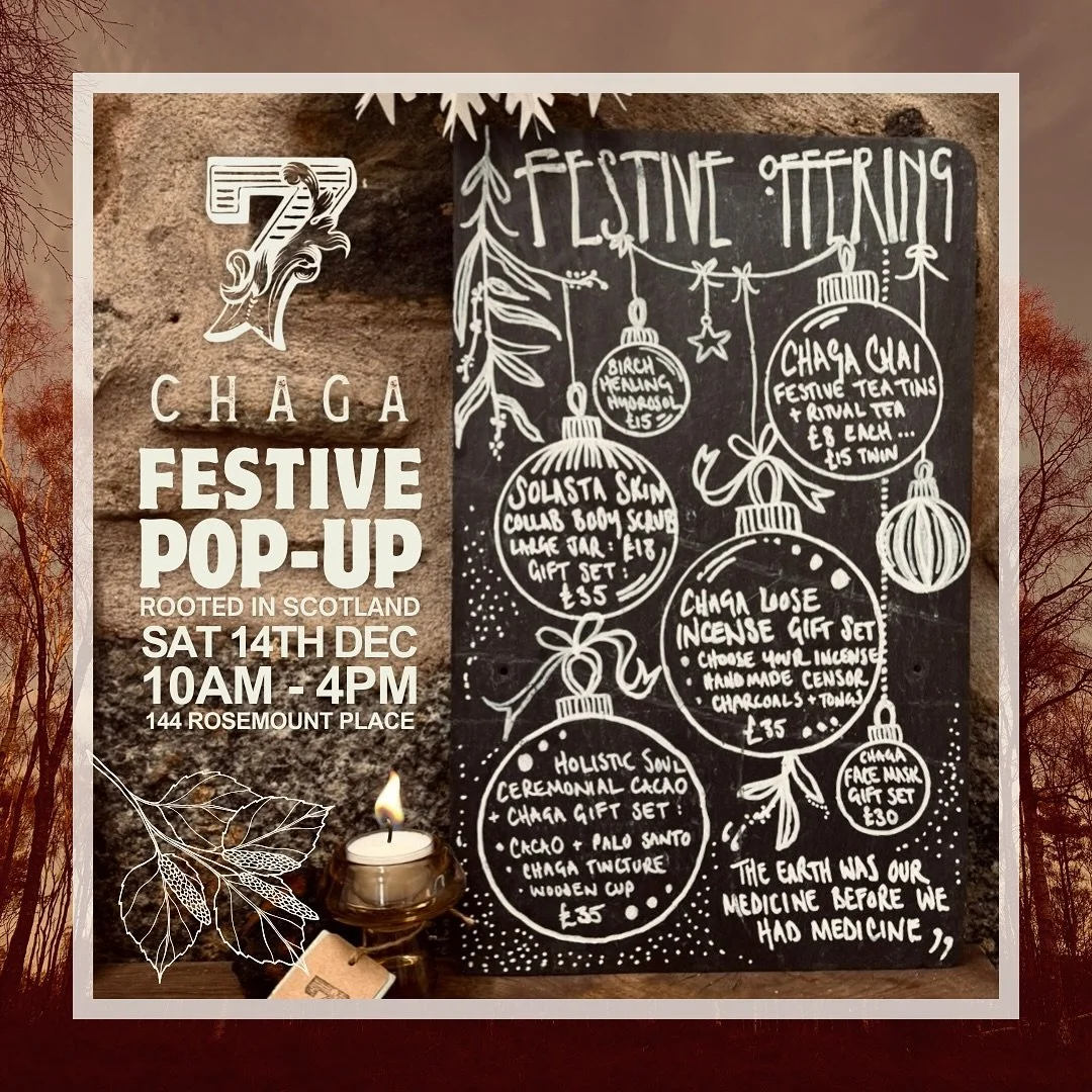 Seven Chaga will be popping up inside Rooted’s botanical emporium! Inside you’ll find lots of fantastic natural gift ideas from chaga tinctures, skincare, gift sets, teas, cacao and more! Rooted will also be stocking her usual gorgeous greenery as well as some beautiful creations from local artists and makers around Scotland.