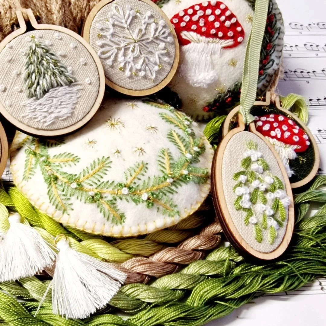 Using a variety of hand stitches and high-quality threads and fabrics, you will spend a meditative day making hand-embroidered pendants and /or hanging decorations inspired by winter flora, fungi and images from nature. You will be provided with lots of small designs for you to choose from and customise, and Kirstie will also be on hand with her creative design skills to help you create your bespoke design. There will be a variety of small frame sizes and shapes to choose from, and you can customise your creation with a selection of different jewellery chains or ribbons so it is ready to wear or gift!
